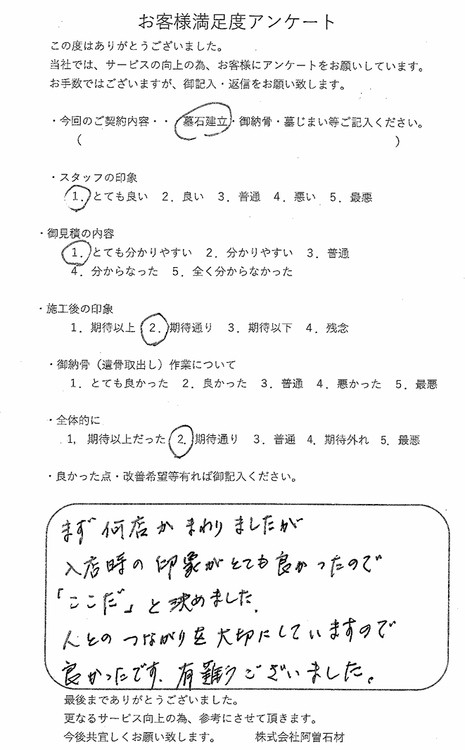 当社にて公営霊園で新規墓所施工のお客様からアンケートの返信が有りました。